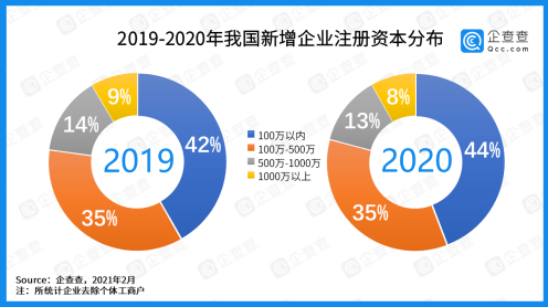 从2020年新注册企业(除去个体工商户)的注册资本分布来看,企查查数据显示,注册资本在100万以内的企业占比44%,比2019年数据增长2个百分点。100万-5000万之间的企业占比35%,与2019年基本相同。500万-1000万、1000万以上的企业占比分别下降1个百分点。