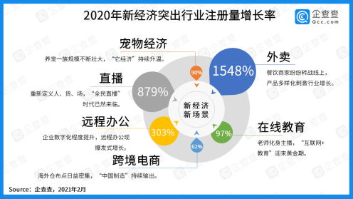 我们选取六个注册量增长较为明显的新经济行业。企查查数据显示,外卖相关企业在2020年的注册量达到77.6万家,同比大涨1548%。在疫情冲击下,餐饮行业受到影响,倒逼行业进行数字化转型升级。另一方面,早餐、下午茶、夜宵等外卖产品的多样化,也不断刺激着消费需求,推动了外卖行业的迅猛增长。