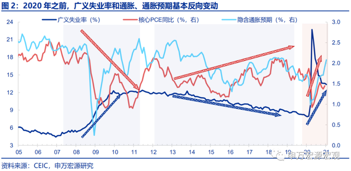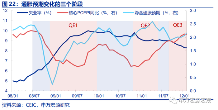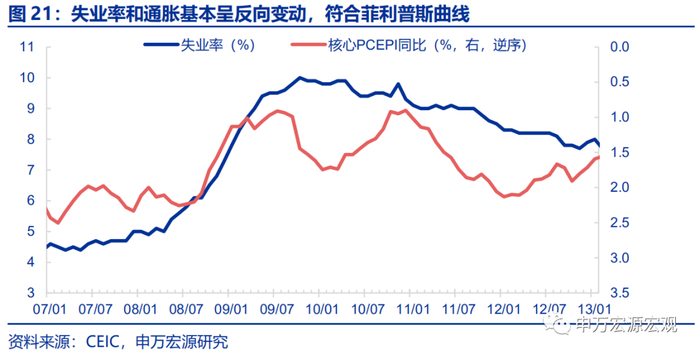 同时失业率在此期间处于高位,通胀和失业率整体符合反向变动的关系:自2008年5月起失业率就开始出现明显抬升势头达到5.4%,此后于2009年10月达到最高点10%,2011年10月才开始降至9.0%以下,这和核心通胀突破2%的时点是相吻合的。