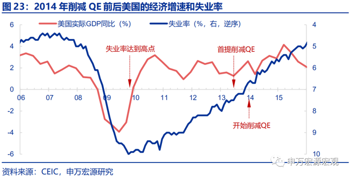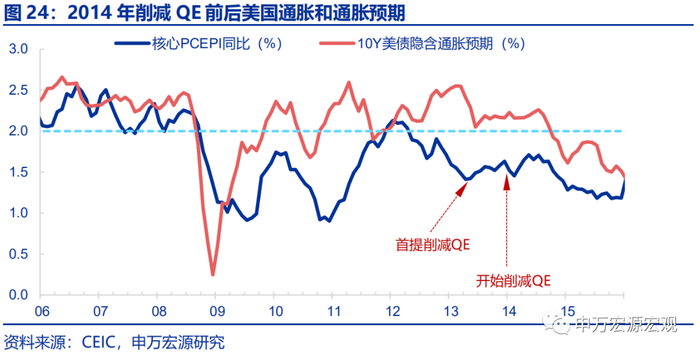 当时经济表现如何?失业率仍在高位,但处在稳定改善通道;真实的核心通胀也并未达目标,但长期通胀预期也持续超过2%。2013年,美国实际GDP增速在危机后已经趋于稳定,而失业率虽然处在高位,但是稳步下降,2013年就业市场恢复进程刚刚过半,2013年1月/5月/12月分别为8.0%、7.5%/6.7%,较最高点下行约3%但距离危机前仍有3%左右的距离。在削减QE后,美国经济并未因此受到负面冲击,而是延续了之前的稳步恢复趋势。同时,2013年核心通胀则始终未超过2%,而是稳定在1.5%左右,但长期通胀预期稳定在2%以上。这说明美联储做出削减QE的决定并不完全依赖于实际的改善出现,而很有可能是依据较好的经济恢复前景。而通胀预期恰恰被作为经济恢复前景的一个关键判断标准。