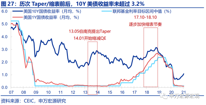 回顾2013年美联储决定削减QE的过程:2013年5月,美联储主席伯南克首次提及“可能削减购债规模”,并在2013年12月议息会议上做出正式决定,于2014年1月开始削减QE,将MBS购买速度从400亿美元/月降至350亿美元/月,国债购买速度从450亿美元/月降至300亿美元/月,此后逐步抵减。