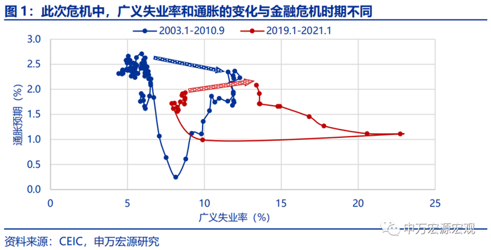 但过去一年,美国经济在遭受疫情冲击并呈现一定的经济危机特征时,失业率和通胀预期出现了反常的同向关系:失业率大幅飙升但通胀预期并未如2008年金融危机时出现大幅下行;随后就业市场改善缓慢,但通胀预期持续上行,导致疫情冲击后至今,失业率高企但通胀预期上行至超过疫情前的水平,与菲利普斯曲线所提出的通常规律相背离。我们依据美联储采取的方法,构造考虑劳动参与率的美国“广义失业率”,发现在疫情冲击前的2020年2月,广义失业率为8.0%,通胀预期为1.6%;而到一年之后的2021年1月,二者分别为13.4%和2.1%,出现了反常的同步上行。