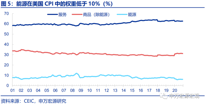 并且油价上行更多是对PPI造成影响,石油制品在CPI中的权重并不大,对于反映长期消费者价格水平的通胀预期并不会造成过大的扰动。通胀预期反映的是消费者价格指数的长期变动,由整体的商品和服务价格预期决定,对于发达经济体而言,服务在CPI中占较大比重,原油和其他能源价格在其中的权重和影响幅度有限,能源整体在2020年美国CPI中的权重仅有6.2%。另一方面,即使油价上行推升了当期通胀水平,随着OPEC和美国页岩油未来趋于增产,原油价格持续飙升的可能性较小。(更为具体的分析,可参考《油价与通胀:历史与现实的宏观视角——通货膨胀系列专题之二》2021.2.26)整体来看,油价上行并不能完全解释长期的通胀预期高增。