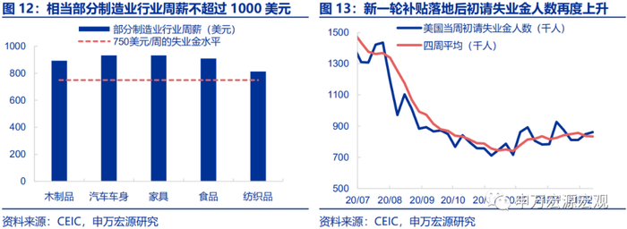 其二是财政过度补贴降低了低收入人群的工作意愿,导致正常情况下相对低收入群体的“主动失业”。大规模的财政补贴实际造成了供需撕裂状况加剧,推高商品需求和价格的同时又形成了“挤出生产效应”,造成通胀预期和失业率双高的局面。疫情以来美国财政部对居民发放了大额补贴,尤其是持续的、较高规模的额外失业补贴,大幅降低了低收入人群的就业意愿。我们测算常规的失业补贴规模约为350美元/周,加上现阶段额外的300美元/周的失业补贴,实际相当于650美元的周薪水平。拜登1.9万亿财政刺激计划中包含400美元/周的额外失业金补贴,失业金就将达到750美元/周,不但已经超过正常状态下的美国最低薪资水平,甚至超过了部分制造业的平均薪资水平,并相当于大部分制造业行业薪资收入的八成,这部分相对低收入的美国制造业就业人员其实没有迅速复工的动力,拖累了劳动力市场的恢复。