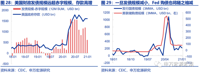此外,美国财政部2020年实际发行的国债规模远大于实际的赤字规模,也为今年减少发债、助推美联储缩减购债规模提供了可能性。2020年,美国发行国债规模达到4.5万亿美元,但实际赤字规模为3.3万亿美元,超出部分已经带来美国政府存款的大幅高增,实际上为今年的财政支出提供了一笔巨大的潜在资金来源,减少了今年发债的必要性。参照去年3月底通过的CARES Act,2020年4-6月的发债规模占到2020年4-12月的71.9%,也就是说,即使假设后期1.9万亿美元刺激计划得到参议院通过,并推高2021年美国财政赤字至3.5万亿美元左右,但考虑到美国财政部2020年的提前融资和政府存款的大规模储备,美国实际2021年的财政融资规模约为2.0-2.5万亿美元,明显少于2020年。其中其融资计划很可能主要在21Q2前完成,延续到21Q3的规模或将有所缩减,21Q4的融资计划更是尚未确定,进一步收缩的概率较大,从而21H2美联储缩减购债规模的空间其实颇大。