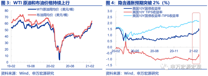 近期伴随着油价的上行,美国10Y TIPS收益率对应的隐含通胀预期不断升高,引发市场对于油价推升通胀预期、进而影响美联储货币政策立场的担忧。布油价格自今年年初至2月22日已经上涨26.4%,至今已突破64美元/桶,回到疫情前水平;美国10Y TIPS对应的隐含通胀预期也不断升高,今年一直处在2%以上,2月一度突破2.2%的高位,推升了10Y美债收益率。但实际上,通胀预期更多是由需求恢复的乐观预期所推升,油价不是导致通胀预期和名义利率上行的全部原因。