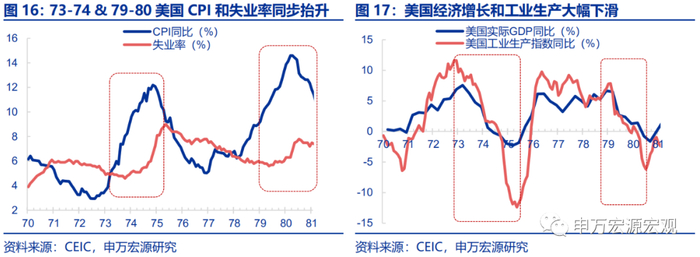 油价上涨直接影响了美国工业生产成本,导致供给大幅收缩,失业率高企,是“滞胀”的主要成因。油价的两次大幅抬升都导致了美国工业生产的收缩和实际经济增速的下滑,进而导致失业率高企;而需求端受到的冲击相对而言不大,形成了商品供不应求的局面,价格普遍抬升。