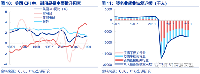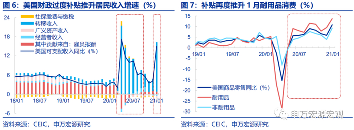 事实上,本轮美国长期通胀预期上行主要是由需求预期走强所驱动,财政的过度补贴直接刺激了美国居民的商品消费需求,从而推动美国核心通胀和长期通胀预期走高。市场正在形成“财政补贴——居民收入——商品消费走强——核心通胀上行”这一预期链条。财政补贴对居民消费的刺激效果是较为直接的,2020年美国财政对居民的补贴直接推升了美国居民的商品消费尤其是耐用品消费。1月14日拜登在正式就任前承诺了1.9万亿美元刺激计划,近日已获美国众议院通过,其中包含1400美元/人的一次性补贴和400美元/周的额外失业金补助,市场对美国消费需求恢复持乐观态度,推升了核心通胀预期。