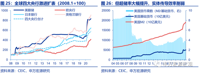 首先,在一次次的货币政策过度刺激之后,美国货币政策到实体经济的传导已经非常微弱,对于通胀和就业都难以起到实质性的总量推动作用。从美联储2008年-2009年的第一轮QE并未拉动需求和核心通胀,就可以看出来大规模的资产购买并不能传导至实体需求,但后续美联储先后实施了四轮QE,美联储资产负债表的大幅扩张已经无法转变为对应的商业银行扩表,而是以超额准备金的不正常大幅积累壅塞在央行负债端。2020年,美联储扩表幅度超70%,但对于实体经济需求影响是非常有限的,也就难以影响到通胀,并带动供给和就业的恢复。