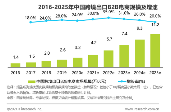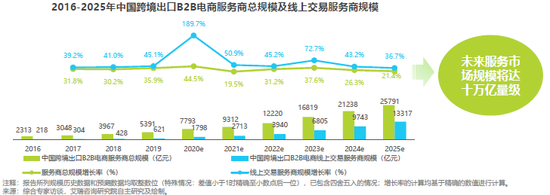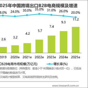 艾瑞认为,相较于C端电商渗透率,B端电商渗透率滞后明显。主要原因是相较于C端,B端交易需要的决策链条更复杂、决策周期更长,相关基础设施及配套服务构建难度也更大。但由于疫情的长期影响、国家政策扶持、各环节不断线上化与信息化,以及B端交易碎片化,B2B交易的线上渗透率预计在5年内出现明显提升。艾瑞《报告》援引数据,2019年中国跨境出口B2B电商市场规模达2.6万亿元,预计2020-2025年复合增速将达28.3%,2025年中国跨境出口B2B规模可达11.2万亿元。