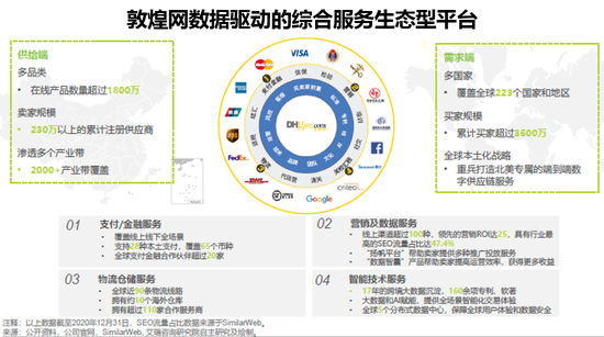 作为典型的新跨境出口B2B电商生态型平台,成立于2004年的敦煌网布局多个国家地区,对主流市场进行本土化深耕,致力于全链路赋能跨境中小企业,提供店铺运营、流量营销、仓储物流、支付金融、关检汇税等痛点解决方案,是业内少有的将交易环节全部线上化、数字化的生态平台。对上下游与业务的多元化布局,使敦煌网具备强大的资源整合优势与强抗风险能力。