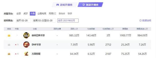 而根据小葫芦统计的数据,《使命召唤》手游自12月公测以来,始终处于斗鱼平台的新游开播榜榜首,2月份活跃人次达到了985万,弹幕数量更是超过了1900万条。
