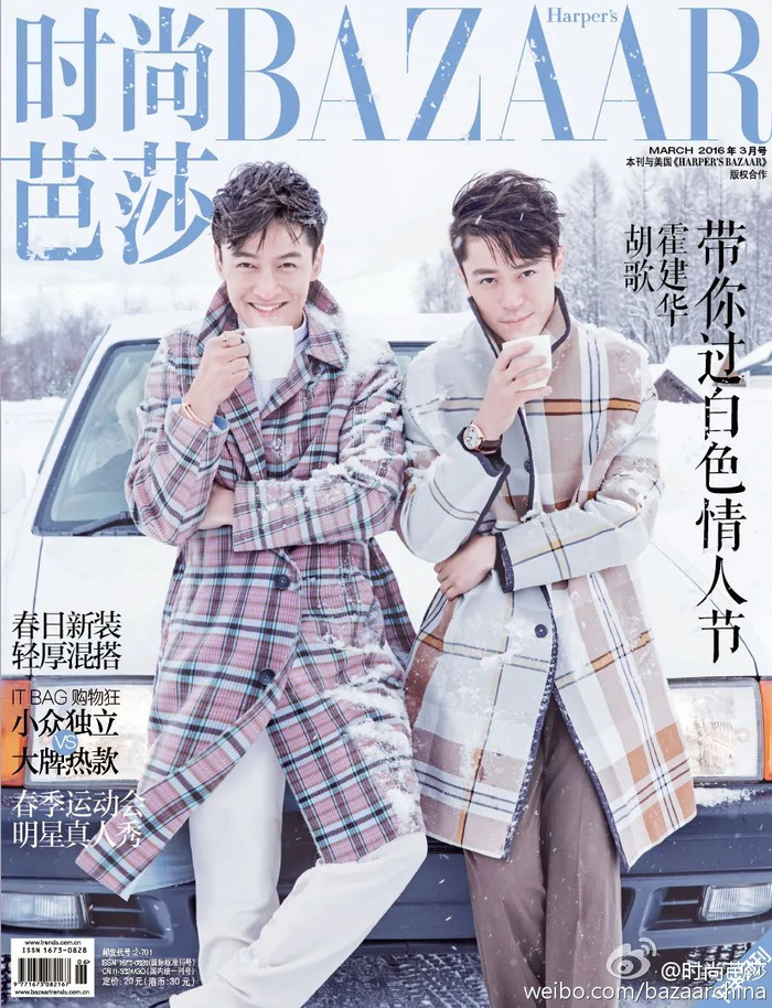 需求之下,商家应势而谋,借助“男色”宣传造势。2015年是男色崛起的元年,随着《琅琊榜》《伪装者》的爆红,《时尚芭莎BAZAAR》在2016年邀请主演之一的胡歌,与霍建华一同拍摄杂志封面,拍摄花絮一经放出,#是胡也是霍!情人节伙着过!#火速登上微博热搜,创造了3.9亿话题阅读量和105.4万人次评论。预售的1万本杂志在15分钟内全部售罄,第一天线上5万本杂志统统脱销。