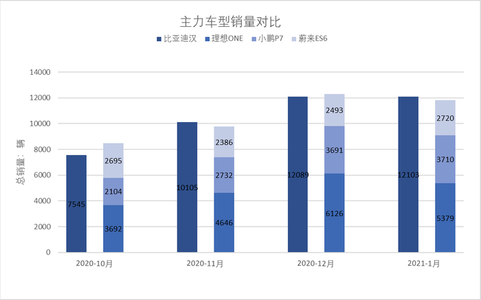 与“蔚小理”相比,比亚迪新能源汽车的销量基本为三者之和,主力车型的情况也大致如此,1月比亚迪汉销量为12103辆,蔚来ES6、小鹏P7、理想ONE分别为2720辆、3710辆、5379辆。