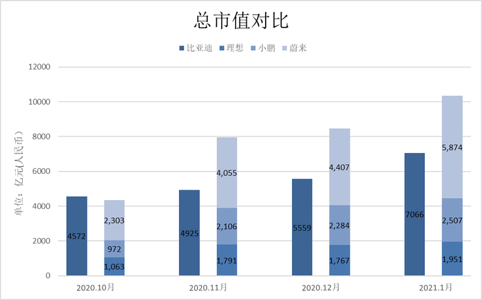 但反观四家公司市值,比亚迪目前约6000亿,“蔚小理”约为5026亿、1812亿、1512亿。比亚迪仅约为三家之和的70%,相比主力车型的销量差距,6000亿市值似乎略显保守。
