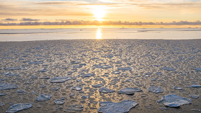 夏季结束,气温逐渐降低,海面上形成的“荷叶冰”。