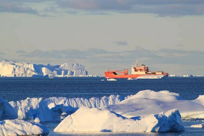 雪龙号破冰船,抵达南极中山站附近的陆缘冰区,停止破冰,等待海冰卸货。