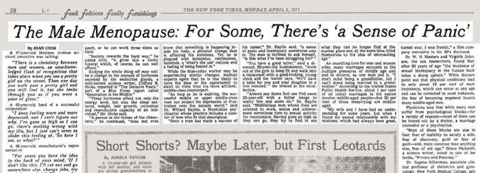 [1] Joan, C. (1971). The Male Menopause: For Some, There's ‘a Sense of Panic’. The New York Times, Page 28.