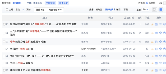 在 90 年代才建立起完整学科体系的中国甚至没怎么仔细研究过“中年危机”。中文核心刊物上只有 40 篇相关论文,其中还有不少是化用中年危机来形容企业和经济的发展。