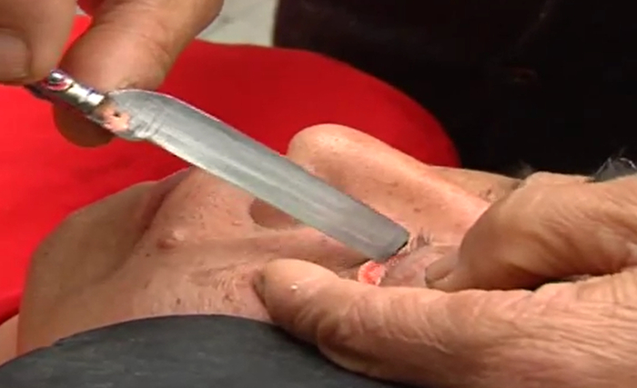 其中刀锋洗眼的兴盛本身就带着时代色彩,它曾是上世纪四五十年代治疗沙眼的土办法,在医疗条件不发达的当时,用这种方式刮掉眼皮里的滤泡和倒睫,能在一定程度上缓解患者的痛苦。