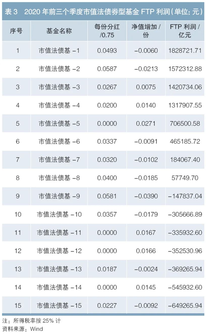 本文从市场中选取15只市值法债券型基金进行分析,相应的FTP利润见表3。2020年前个三季度,选取的15只基金中有8只盈利,7只出现亏损。投资中应重点关注亏损产品,及时与其管理人进行沟通,探讨亏损原因,调整投资策略。同时,应定期对债券型基金市场表现进行分析,以便为进一步申赎决策提供依据。