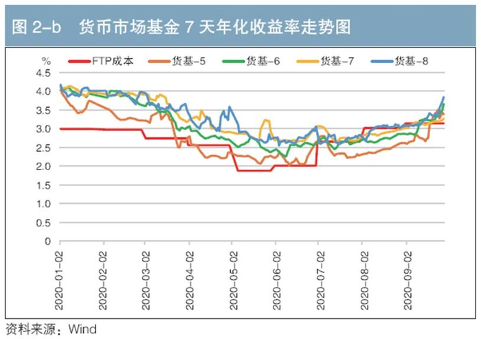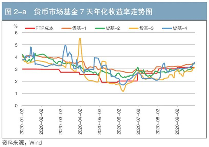 图2-a和图2-b为从市场中挑选的8只典型货币市场基金7日年化收益率与FTP成本的对比图。在2020年前两个季度,大部分投资货币市场基金的业务都是盈利的。从三季度开始,由于FTP成本上升较快而货币市场基金收益率上涨具有滞后性,部分投资货币市场基金的业务出现亏损。但投资表现相对较好的产品基本一直处于盈利状态,如货基-1,而货基-3和货基-5的业绩表现相对较差。