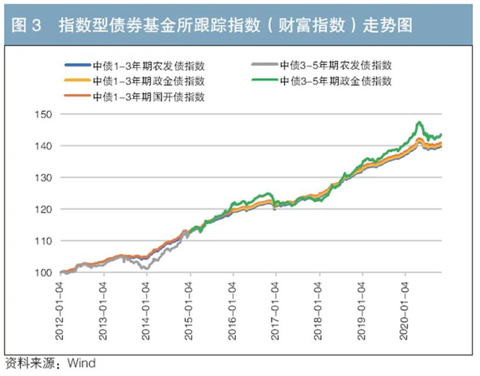本文从市场中选取5只典型的指数型债券基金加以分析,所跟踪指数的代码如表1所示。图3为5只基金对应标的指数的走势情况。分析发现,相同期限的国开债指数、农发债指数和政金债指数变化基本相同;久期越长的指数波动性越大。