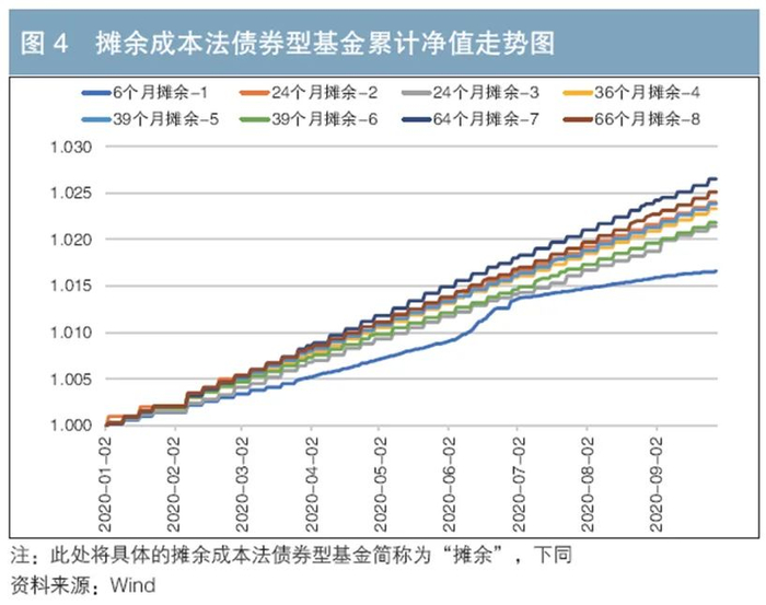本文从市场中选取8只不同摊余期限的债券型基金进行分析,由图4和表2可知,基金累计净值走势与时间线性关系良好,市场表现与封闭期长短和初始投资时市场行情密切相关。总体来看,基金封闭期越长,其累计净值上升越快。64个月摊余-7和66个月摊余-8的表现最优。与其他同期限的产品相比,24个月摊余-3和39个月摊余-6的表现相对较差。6个月摊余-1在2020年6月底净值走势出现转折,是因为该基金资产到期后重新进行了配置。