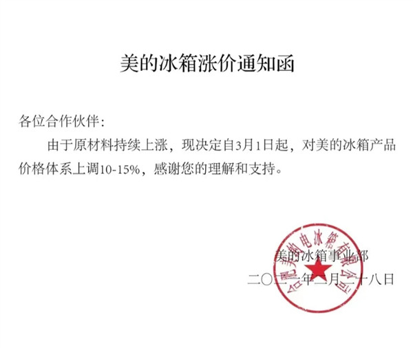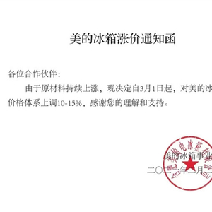 由于面板以及芯片等原材料供不应求,电视已经涨价多时。不过近期,冰箱、洗衣机等白色家电也迎来了涨价潮,多家企业宣布上调产品价格。日前,美的冰箱向渠道商发放涨价通知函,由于原材料持续上涨,3月1日起,美的冰箱价格上调10%到15%。
