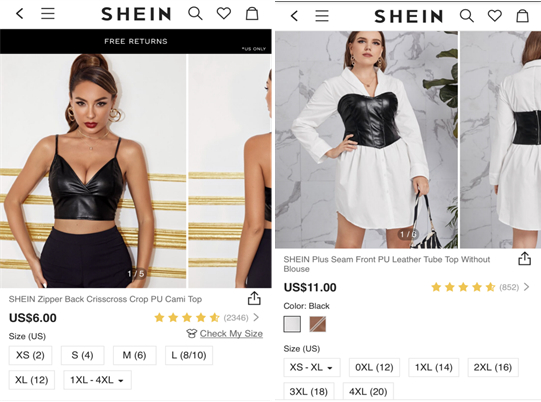 在 APP 上似乎也能看到 “SHEIN” 对这一理念宣传的实际行动,“SHEIN” 的 the all sizes catwalk X“SHEIN”Body 系列中,共有 53 款产品,以贴身内搭为主,部分款式的确推出了 8 种尺码,从通常的 XS-L 增加至 XS-4XL。但是看大多数的产品展示页,还是仅有 5 个尺寸,“SHEIN”这次的合作宣传很大程度上还是停留在口头上。