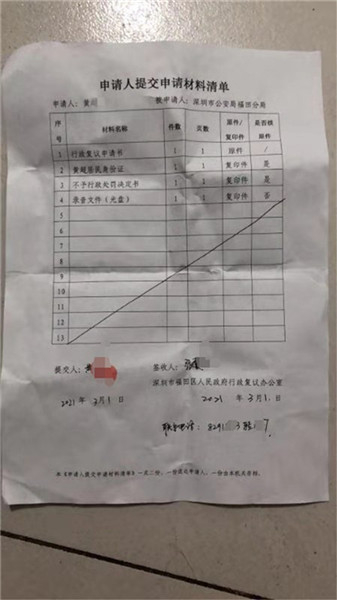 3月2日,黄女士告诉记者,她在3月1日已经到深圳市福田区人民政府行政复议办公室提出了行政复议,要求撤销《深圳市公安局福田分局不予行政处罚决定书》。