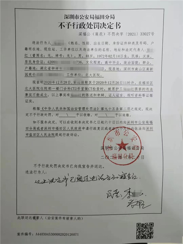 根据黄女士提供的2021年1月20日的《深圳市公安局福田分局不予行政处罚决定书》显示,“现查明2020年12月28日,黄某报称其于2020年12月26日上午11时许,在福田区北大医院住院部一楼门诊科CT12号室做CT检查时,被男护工寇某红猥亵的违法事实不能成立,以上事实有寇某红的陈述和申辩、证人证言、视听资料等证据证实。根据《中华人民共和国治安管理处罚法》第九十五条第二项之规定,现决定不予行政处罚……”