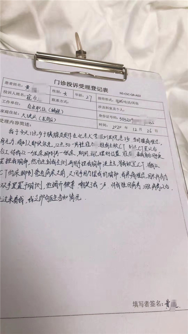 2月25日,四川女孩黄女士反映,2020年12月26日上午10时,她因急性胰腺炎发作,打车到了北京大学深圳医院求医。因其病情严重,当她下车来到该院急诊室时,她的肚子疼得处于精神崩溃状态,就直接就倒在了护士的工作台旁。随后,她被人扶上了一张病床,在11时55分左右时,医生让一名50岁左右的男护工推着她去做CT检查。