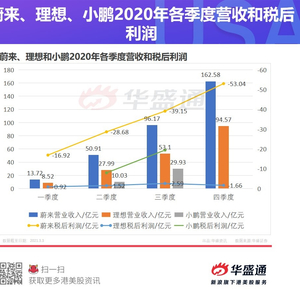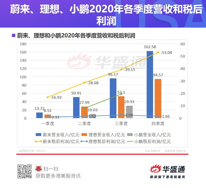 据华盛通不完全数据统计显示,2020年,蔚来汽车营收162.58亿元,净亏损为53.04亿元,较前两年大幅收窄。而理想2020年营收94.57亿元,净亏损为1.66亿元。