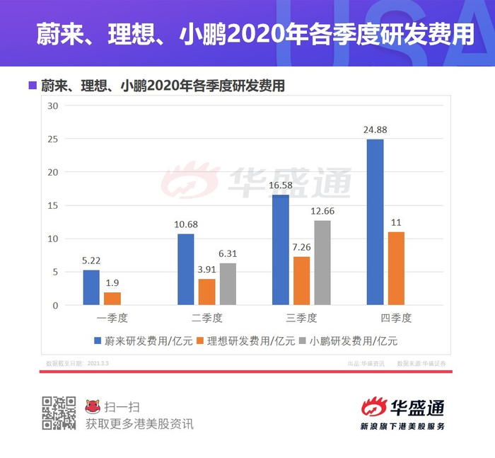 对于科技研究公司来说,研发的投入是很重要的。从财报数据上看,理想汽车2020年的研发费用为11亿元,比2019年的11.7亿元还下降了6%。蔚来去年的研发费用为24.9亿元,还没公布2020全年财报的小鹏,前三季度研发支出为12.66亿元。因此就目前的数据上看,蔚来研发费用最高,其次是小鹏,最后才是理想。