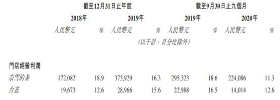2018年至2020年前九月,“奈雪的茶”品牌门店经营利润率分别为18.9%16.3%11.3%;“台盖”品牌门店经营利润率分别为12.6%15.6%12.6%