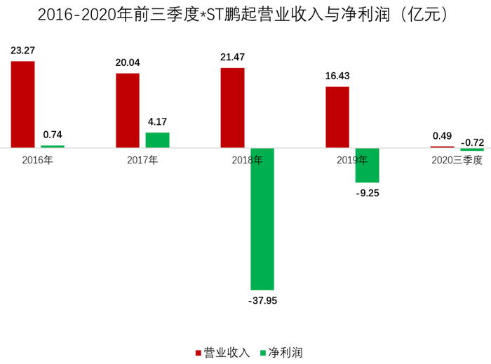 但在张朋起入主后,*ST鹏起的业绩却一落千丈,已连续3年遭遇亏损。2020年前三季度,公司经营更是几乎停滞,营业收入仅有4900万,同比暴跌96%。