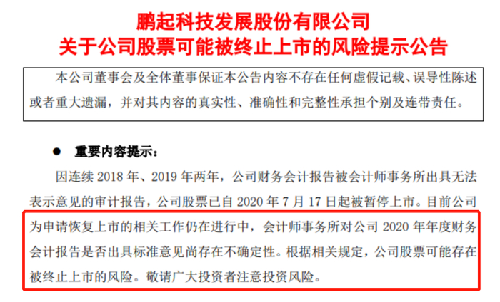2021年1月14日,*ST鹏起发布了退市风险提示公告,因2018年、2019年,公司财报被会计师事务所出具无法表示意见的审计报告,公司股票已自2020年7月17日起被暂停上市。目前公司为申请恢复上市的相关工作仍在进行中,会计师事务所对公司2020年年度财务会计报告是否出具标准意见尚存在不确定性。公司股票可能存在退市的风险。