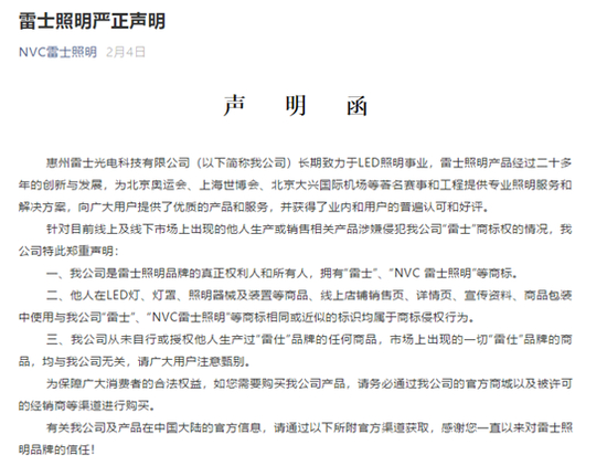 雷士照明,2月4日曾针对目前线上及线下市场上出现的他人生产或销售相关产品涉嫌侵犯“雷士”商标权一事发布《声明函》表示:“我公司是雷士照明品牌的真正权利人和所有人,拥有‘雷士’‘NVC雷士照明’等商标。”雷士还郑重提醒:“为保障广大消费者的合法权益,如您需要购买我公司产品,请务必通过我公司的官方商城以及被许可的经销商等渠道进行购买。”