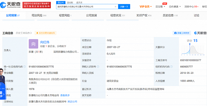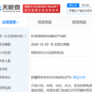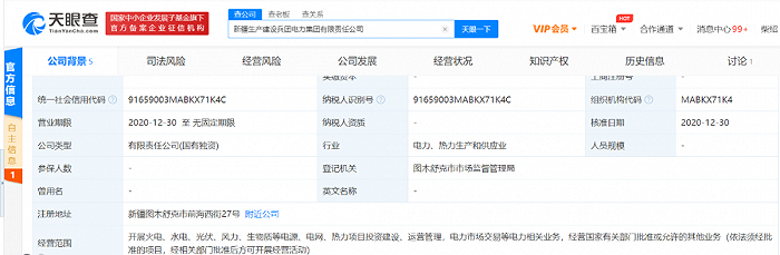 根据天眼查数据显示,新疆生产建设兵团电力集团有限公司正式注册于2020年12月30日,注册资本5亿元,其主要业务涵盖:火电、水电、光伏、风力、生物质等电源、电网、热力项目投资建设、运营管理,电力市场交易等电力相关业务。