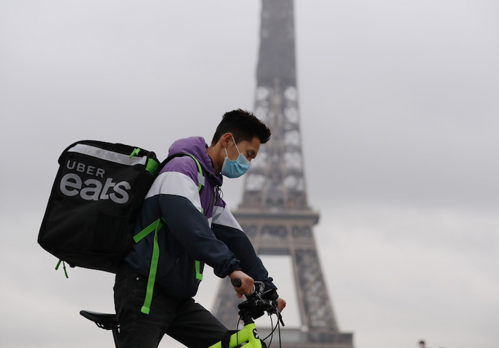 2020年10月23日,一名外卖送餐员经过法国巴黎埃菲尔铁塔附近的特罗卡德罗广场。