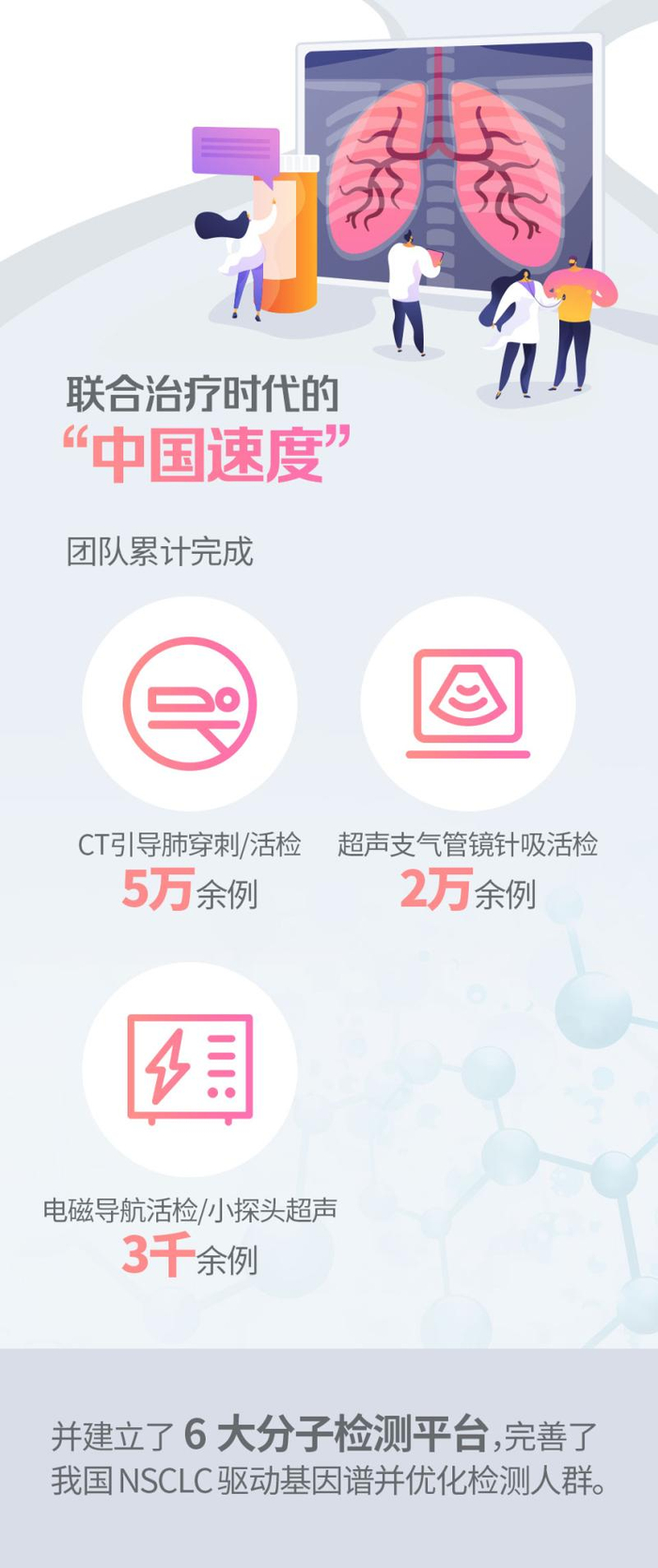 他也坦言,“随着肺癌患者数量的不断上升,我不可能有精力为每个患者诊疗。因此,我们建立健全了肺癌小标本获取方法和驱动基因快速精准检测平台,希望为更多医疗机构带来推广应用的可能性。”团队累计完成CT引导肺穿刺/活检5万余例、超声支气管镜针吸活检2万余例、电磁导航活检/小探头超声3千余例并建立了6大分子检测平台,完善了我国NSCLC驱动基因谱并优化检测人群,《欧洲癌症杂志》系统据此介绍了肺癌诊疗的“中国速度”。