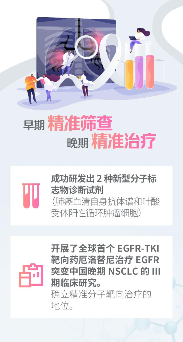 为此,团队在国际上率先建立驱动基因阳性晚期NSCLC精准化治疗策略和全程管理路径,突破肺部小标本获取禁区,在国内率先建立全面的小标本获取方法和精准快速分子检测平台,完善我国晚期NSCLC分子分型谱;基于此,团队还开展了全球首个EGFR-TKI靶向药厄洛替尼治疗EGFR突变中国晚期NSCLC的III期临床研究,确立精准分子靶向治疗的地位。