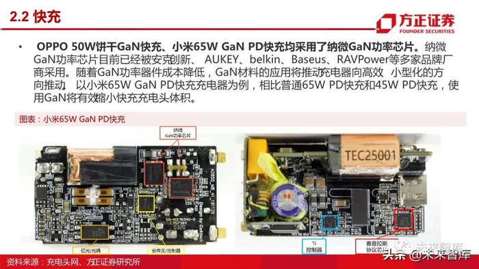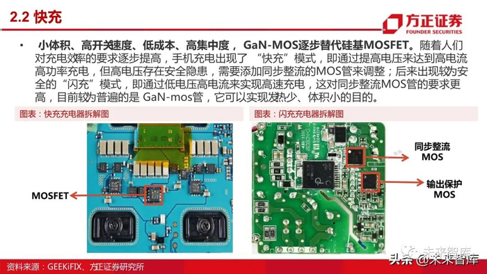 小体积、高开关速度、低成本、高集中度, GaN-MOS逐步替代硅基MOSFET。随着人们 对充电效率的要求逐步提高,手机充电出现了 “快充”模式,即通过提高电压来达到高电流 高功率充电,但高电压存在安全隐患,需要添加同步整流的MOS管来调整;后来出现较为安全的“闪充”模式,即通过低电压高电流来实现高速充电,这对同步整流MOS管的要求更 高,目前较为普遍的是 GaN-mos管,它可以实现发热少、体积小的目的。