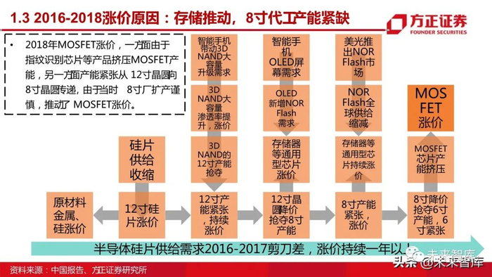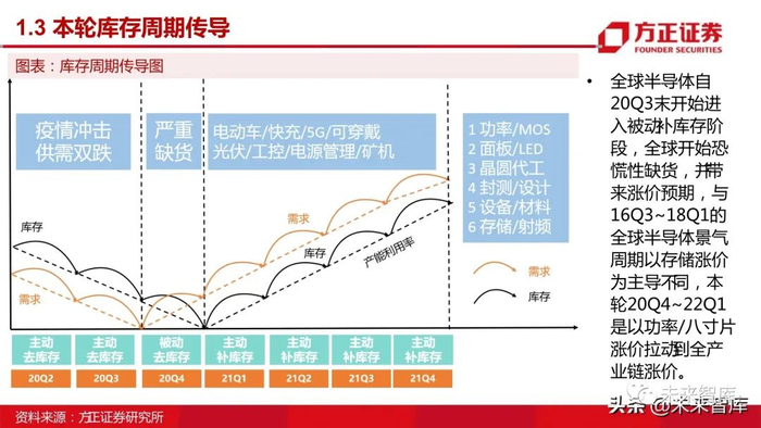 MOSFET价格上涨,产业链相关公司受益。 全球半导体自20Q3末开始进入被动补库存阶段,全球开始恐慌性缺货,并带来涨价预期,与16Q3~18Q1的全球半导体景气周期以存储涨价为主导不同,本轮 20Q4~22Q1是以功率/8寸片涨价拉动到全产业链涨价。