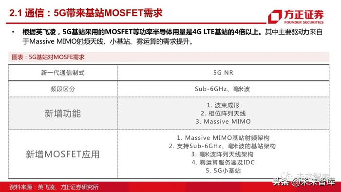 根据英飞凌,5G基站采用的MOSFET等功率半导体用量是4G LTE基站的4倍以上。其中主要驱动力来自于Massive MIMO射频天线、小基站、雾运算的需求提升。