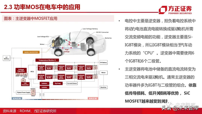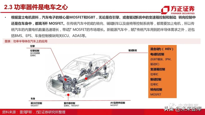根据富士电机资料,汽车电子的核心是MOSFET和IGBT,无论是在引擎、或者驱动系统中的变速箱控制和制动、转向控制中 还是在车身中,都离不开 MOSFET。在传统汽车中的助力转向、辅助刹车以及座椅等控制系统等,都需要加上电机,所以传 统汽车的内置电机数量迅速增长,带动了 MOSFET的市场增长。新能源汽车中,除了传统汽车用到的半导体需求之外,还包 括BMS、EPS、车身控制模块网关 ECU、ADAS等。