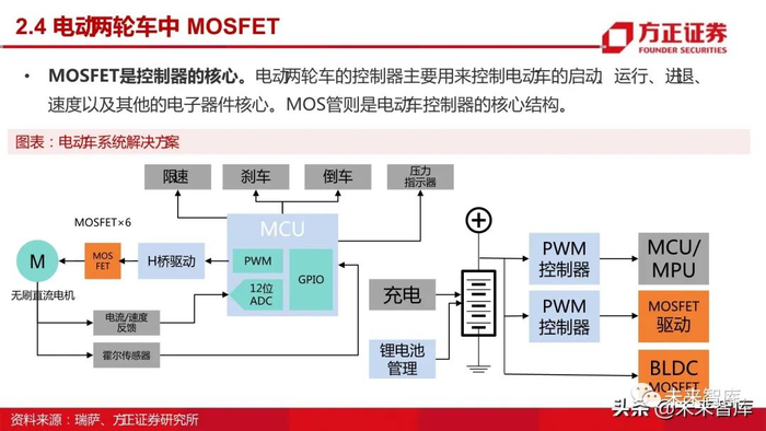 MOSFET是控制器的核心。电动两轮车的控制器主要用来控制电动车的启动、运行、进退、 速度以及其他的电子器件核心。MOS管则是电动车控制器的核心结构。