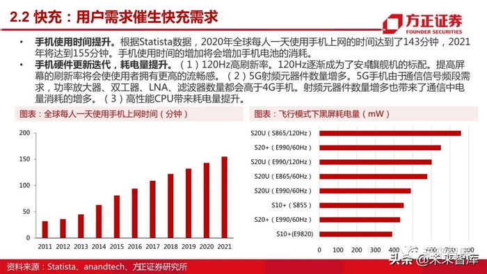 手机使用时间提升。根据Statista数据,2020年全球每人一天使用手机上网的时间达到了143分钟,2021 年将达到155分钟。手机使用时间的增加将会增加手机电池的消耗。
