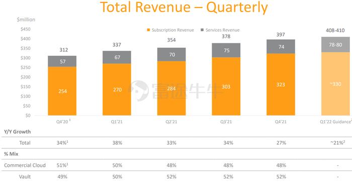 从营收来看,Veeva去年Q4实现3.97亿美元的收入,超过之前指引的3.8亿美元,同比增长27%。其收入构成主要包括订阅收入和服务收入。其中订阅收入占比高达81%。